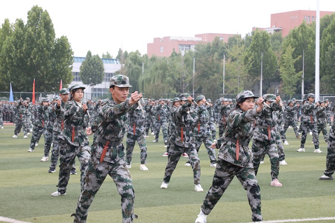 军训成果汇报科目分为分列式、捕俘拳、刺杀操、匕首操、擒敌拳及战术基础等6个科目。旌旗猎猎,口号嘹亮。各院新生以蓬勃的朝气、如火的热情展示了此次军训成果。分列式方阵依次走正步通过主席台,大家个个精神抖擞、目光坚定,尽显青春风采与纪律严明;捕俘拳表演刚劲有力,出拳迅猛、踢腿凌厉,一招一式都在展现着新生们不畏艰难的拼搏精神;刺杀操方阵气势如虹,学生们手持模拟步枪,刺杀动作精准果断,尽显热血豪情;匕首操表演灵动利落,劈、刺、削等动作连贯流畅,将力量与技巧完美融合;擒敌拳方阵整齐划一,拳风呼啸,每一个动作都刚柔并济,打出了新生们的精气神;战术基础展示紧张逼真,新生们快速卧倒、匍匐前进、战术隐蔽,一系列动作娴熟规范,使观众身临其境。