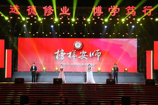 “五星红旗迎风飘扬,胜利歌声多么响亮,歌唱我们亲爱的祖国,从今走向繁荣富强……”10月15日晚,在深沉优美的《歌唱祖国》旋律中,2025年榜样安师颁奖典礼暨迎新晚会拉开帷幕。校长孔国庆,校党委副书记牛晓玉、王宏伟,纪委书记、监察专员仲利娟,副校长杜记民、刘振红、杨新宇、柏䶮、时斌,各职能部门负责人,各学院党委书记、院长、副书记、辅导员,附属小学、附属幼儿园的领导老师,获奖先进集体和个人代表以及全体2025级新生共同观看了颁奖典礼。