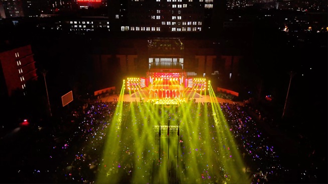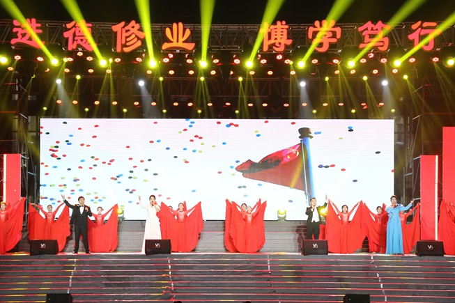 山河如画,奋进如歌。典礼紧扣纪念中国人民抗日战争暨世界反法西斯战争胜利80周年、新中国76周年华诞主题,设置思源承壮志、筑梦正青春、放歌新时代三大篇章。情景剧《永远的抗日联军》再现抗联将士爬冰卧雪、绝不屈服的壮志;《游击队之歌》用情景表演还原中华儿女在绝境中辟生路的机智与果敢。“渠水无言清如许,精神不朽永流传。”歌舞《红色·天河》中展现了林县人民绝壁穿石、挖渠千里的情景。《了不起的年轻人》《再一次出发》等节目通过活力满满的歌声和动感的舞姿,立体诠释新时代青年的蓬勃朝气和向上力量。观众席的灯光一一点亮,随旋律轻轻摇曳,汇聚成耀眼“星河”,文鼎广场霎时变成了星光璀璨的海洋。