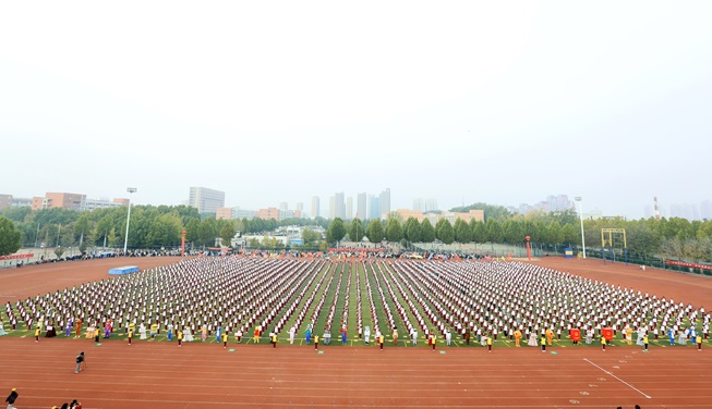 10月24日,我校在北田径场上举办以“心向红旗渠,拼搏向未来”为主题的第十三届心理健康运动会。校党委副书记牛晓玉、王宏伟,副校长杨新宇、柏䶮、时斌,安阳市第七人民医院、安阳职业技术学院、安阳市中小学等友好单位代表,运动会组委会成员、各学院负责人及师生万余人参加开幕式。时斌主持开幕式。
